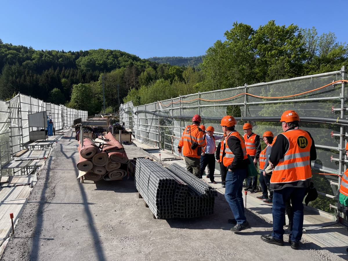 Nach Ankunft in Corcelles wurden wir vom Verantwortlichen Bauteam mit Kurt Wagner und Stéphanie Verneret empfangen. In einem ersten Teil zeigten sie uns die Sanierung des Corcelles Viadukts im Zusammenhang mit dem Projekt Weissensteintunnel. Auf einem sehr imposanten und informativen Rundgang zeigten sie uns die Baufortschritte und die weiteren Arbeiten an diesem denkmalgeschützten Objekt. Anschliessend orientierte uns Kurt Wagner über den Stand und den Fortschritt der Arbeiten auf der Strecke Solothurn – Moutier. Dabei erklärte er uns die Schwierigkeiten im Weissensteintunnel und legte mit Überzeugung die Wiedereröffnung auf den 06. Juni 2026 fest. An dieser Stelle gebührt ein grosser Dank dem Team der BLS für die spektakuläre und interessante Führung und die kompetenten Informationen.